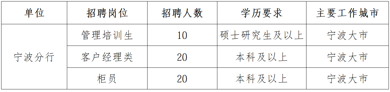根据业务发展需要,中信银行宁波分行诚聘境内外高等院校应届毕业生。有关事项公告如下: